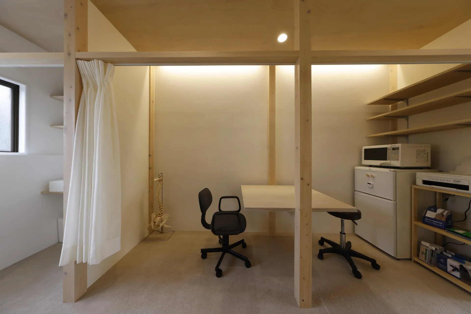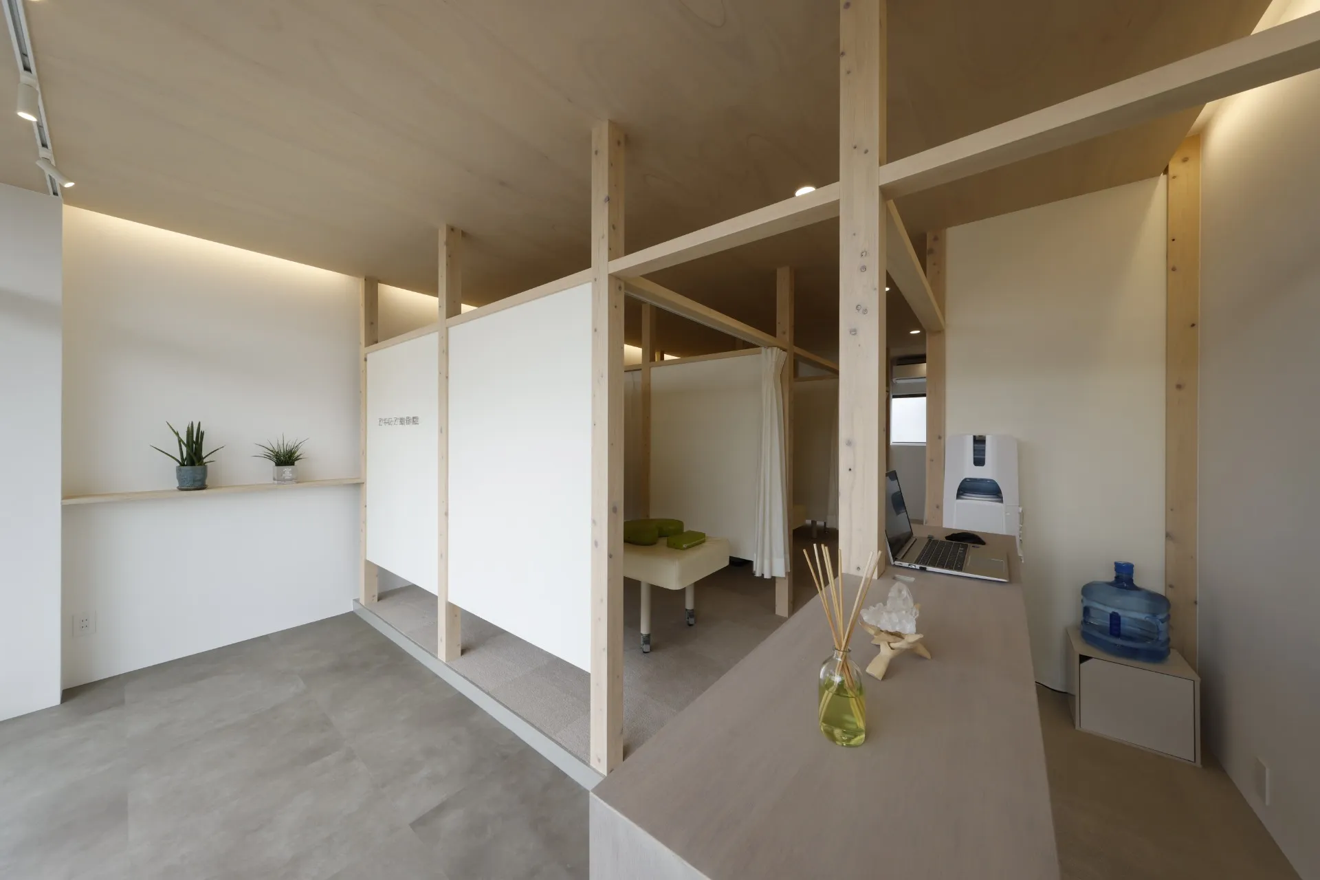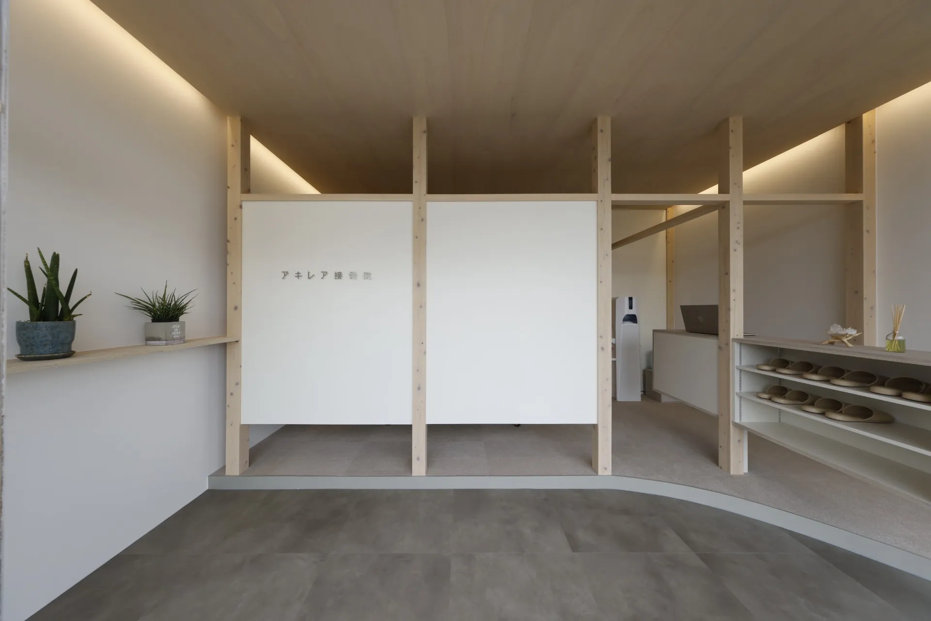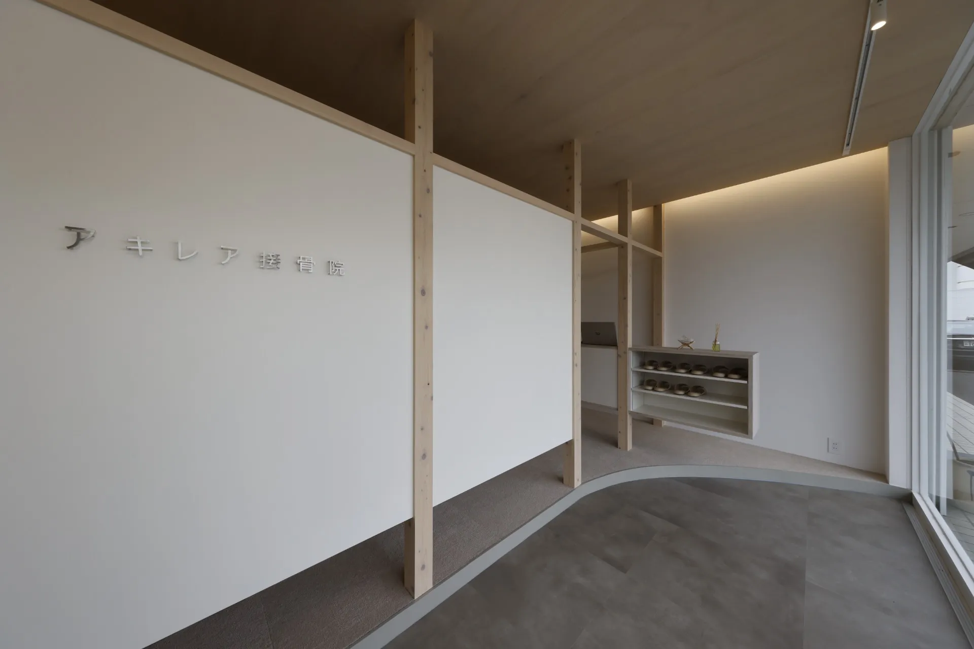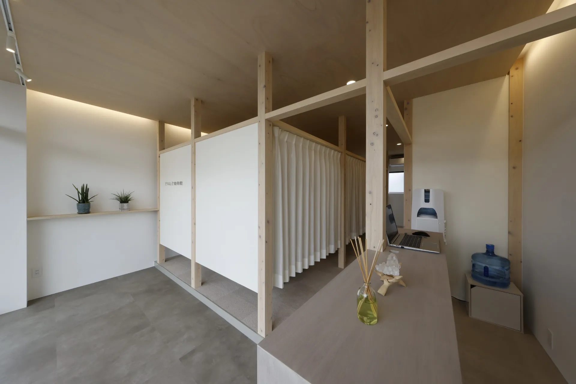院名でもある「アキレア」の花言葉「癒し・治癒・真心」をコンセプトに、軽量鉄骨の無機質な空間に化粧柱と真壁によりパーテーションを構築。患者様が安らげる空間になるようリノベーションしました。アキレアの白い花に合わせて清潔感のあるふわっと優しい雰囲気を目指しました。真壁風の白壁とレースカーテンが優しい印象となり、温かく柔らかな間接照明が患者さんの緊張を和らげてくれます。
