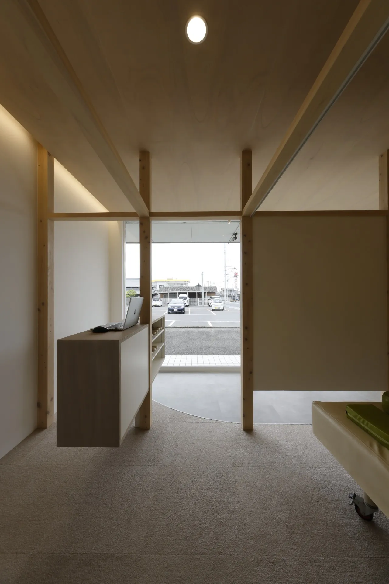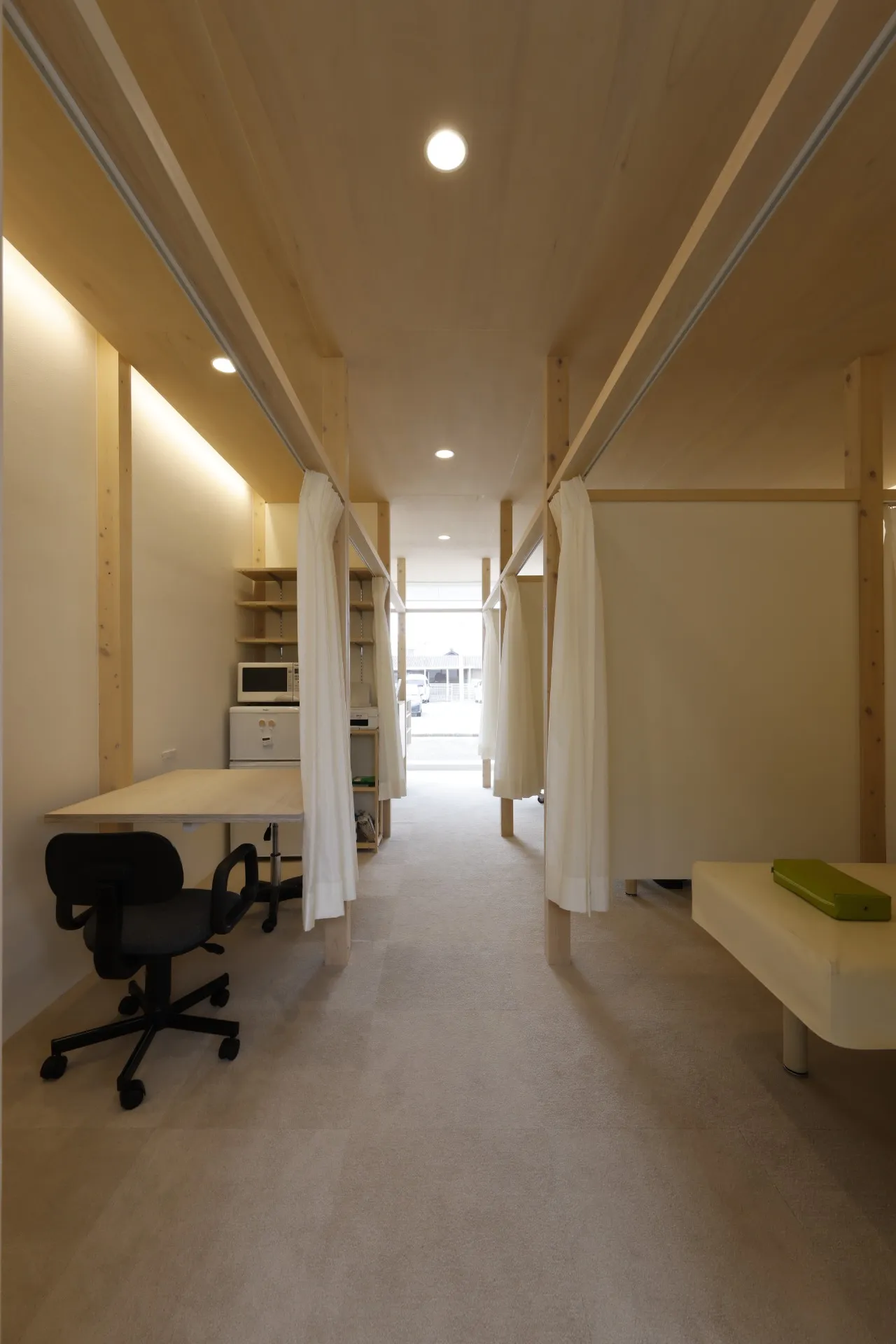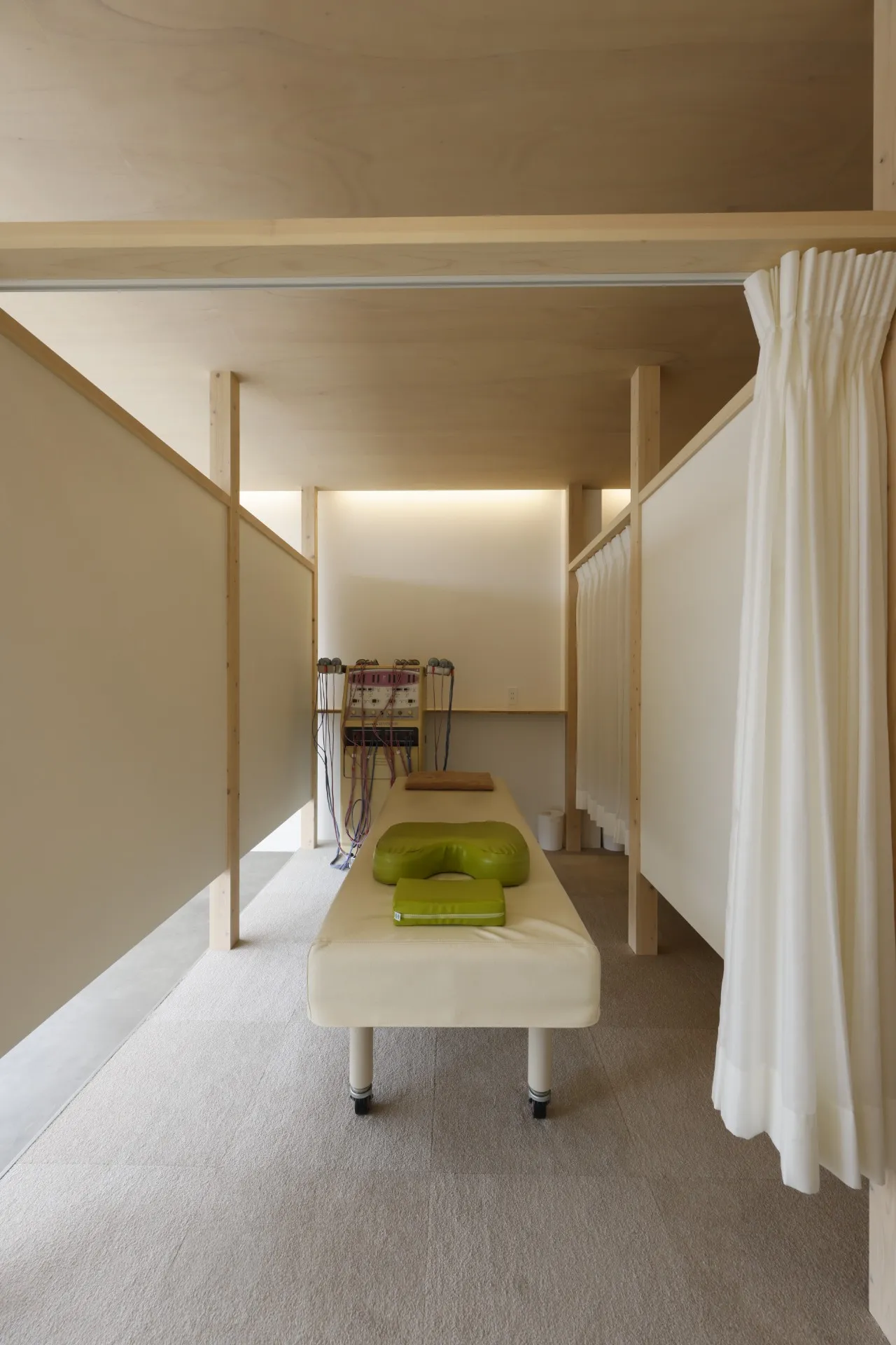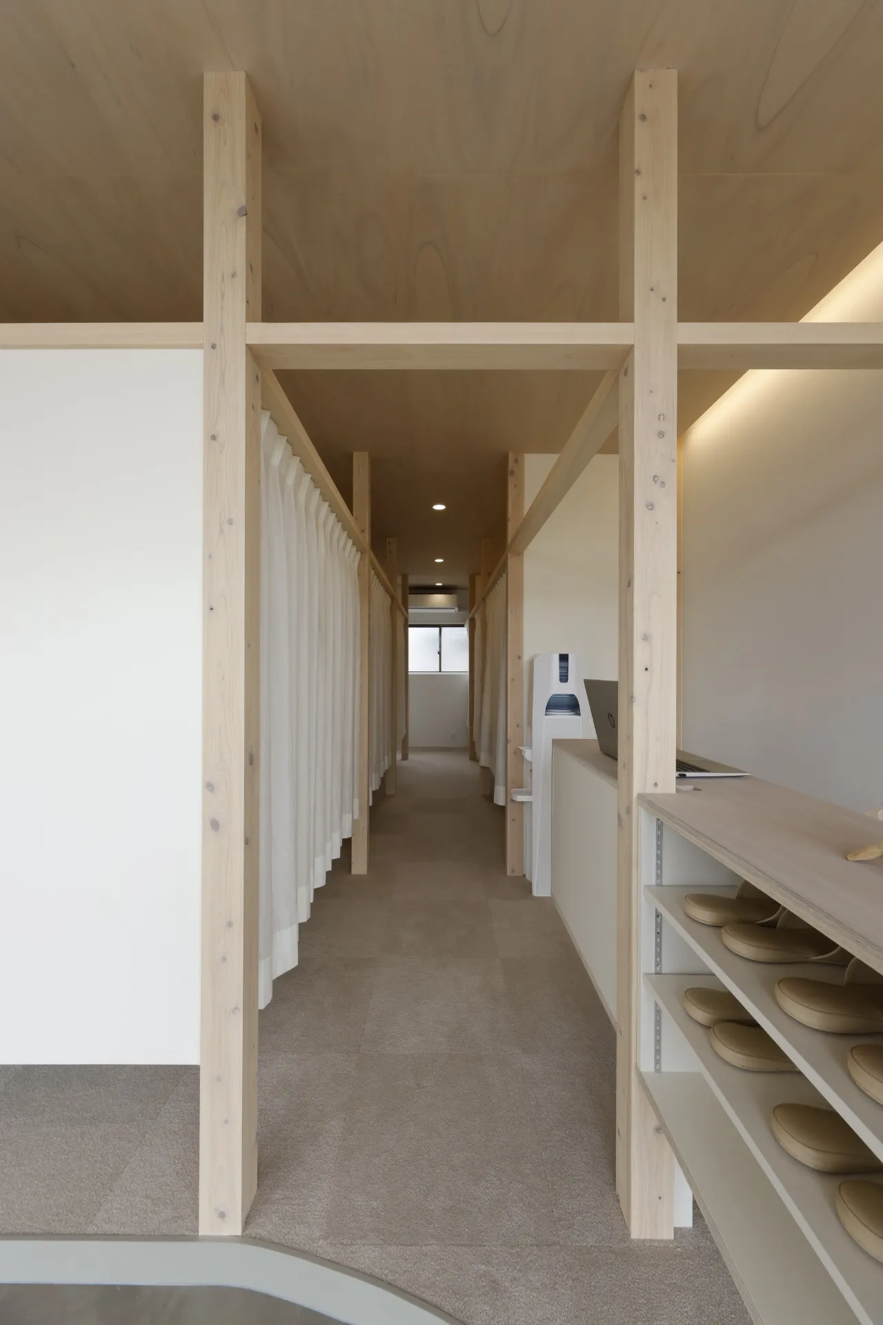 院名でもある「アキレア」の花言葉「癒し・治癒・真心」をコンセプトに、軽量鉄骨の無機質な空間に化粧柱と真壁によりパーテーションを構築。患者様が安らげる空間になるようリノベーションしました。アキレアの白い花に合わせて清潔感のあるふわっと優しい雰囲気を目指しました。真壁風の白壁とレースカーテンが優しい印象となり、温かく柔らかな間接照明が患者さんの緊張を和らげてくれます。