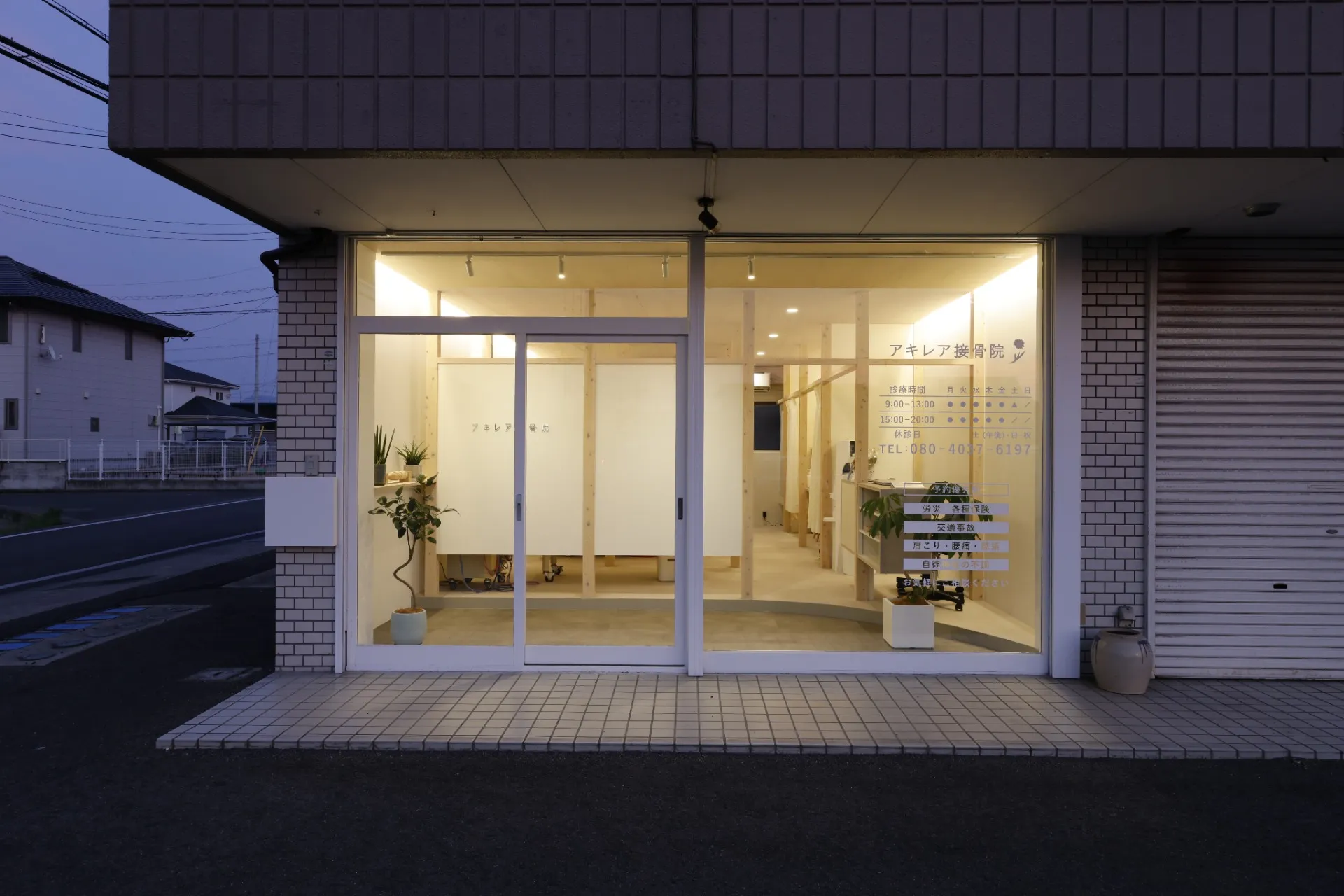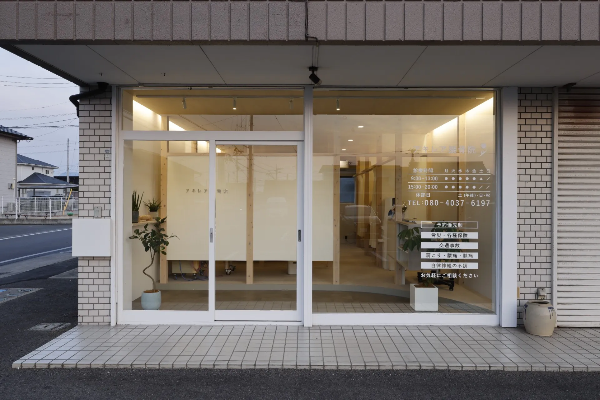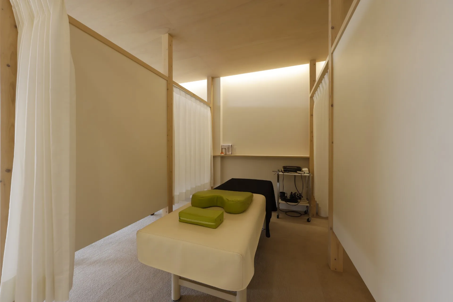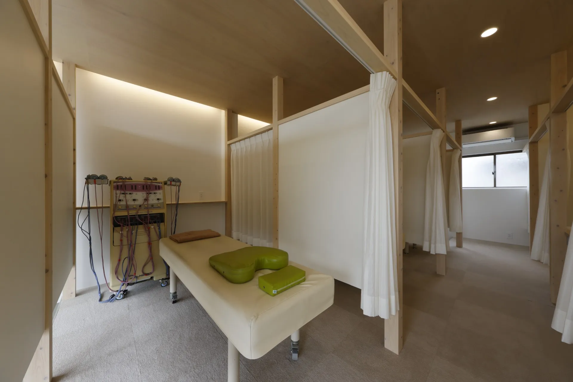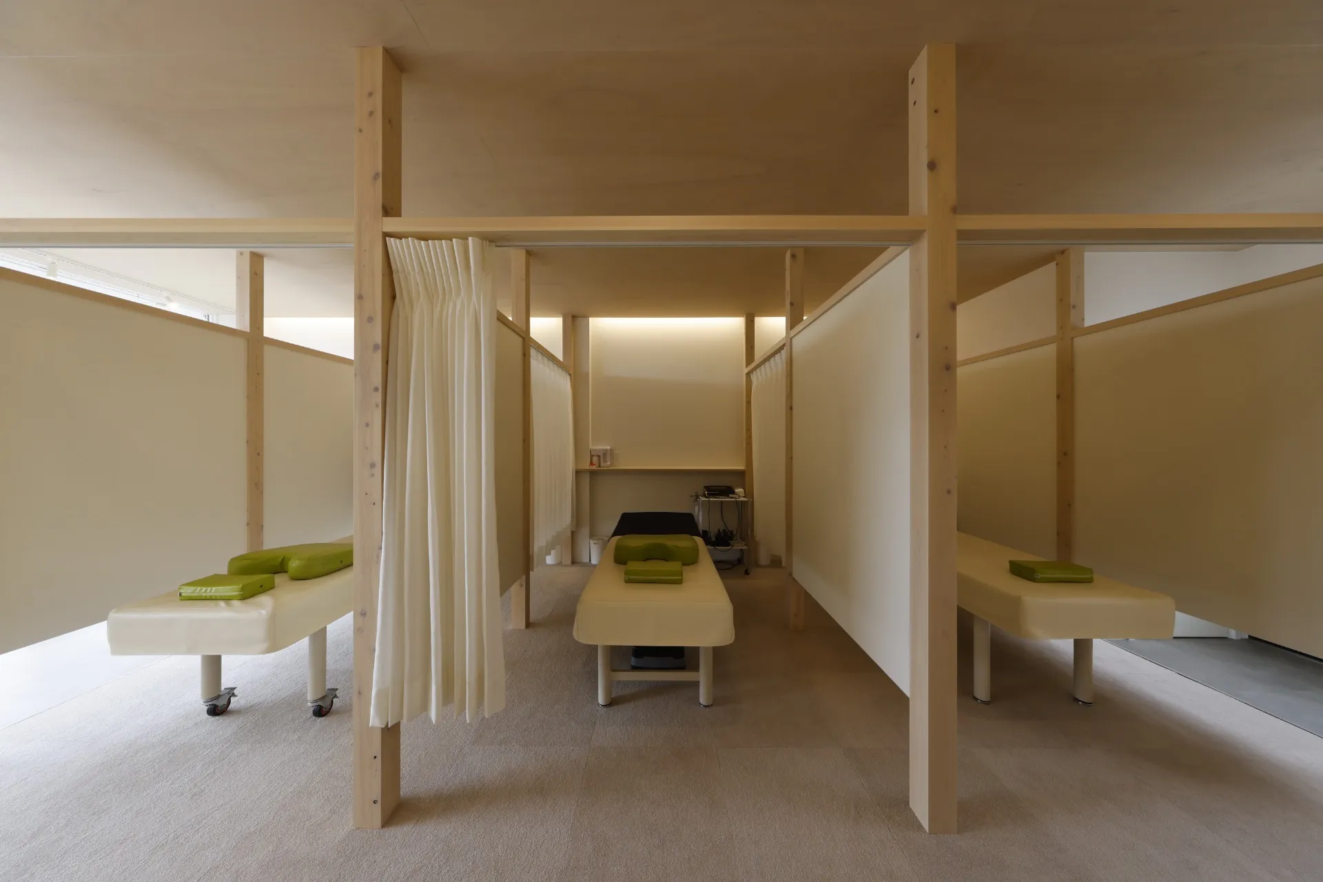 院名でもある「アキレア」の花言葉「癒し・治癒・真心」をコンセプトに、軽量鉄骨の無機質な空間に化粧柱と真壁によりパーテーションを構築。患者様が安らげる空間になるようリノベーションしました。アキレアの白い花に合わせて清潔感のあるふわっと優しい雰囲気を目指しました。真壁風の白壁とレースカーテンが優しい印象となり、温かく柔らかな間接照明が患者さんの緊張を和らげてくれます。