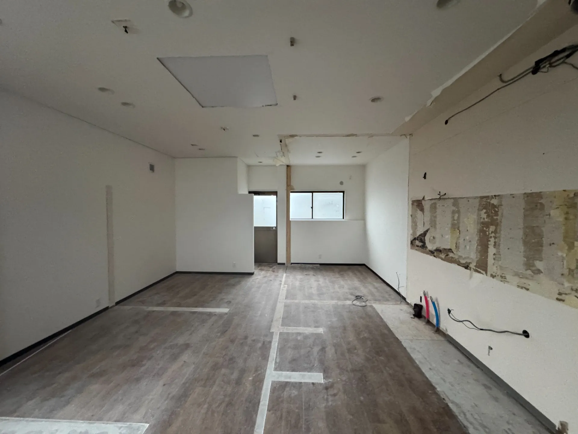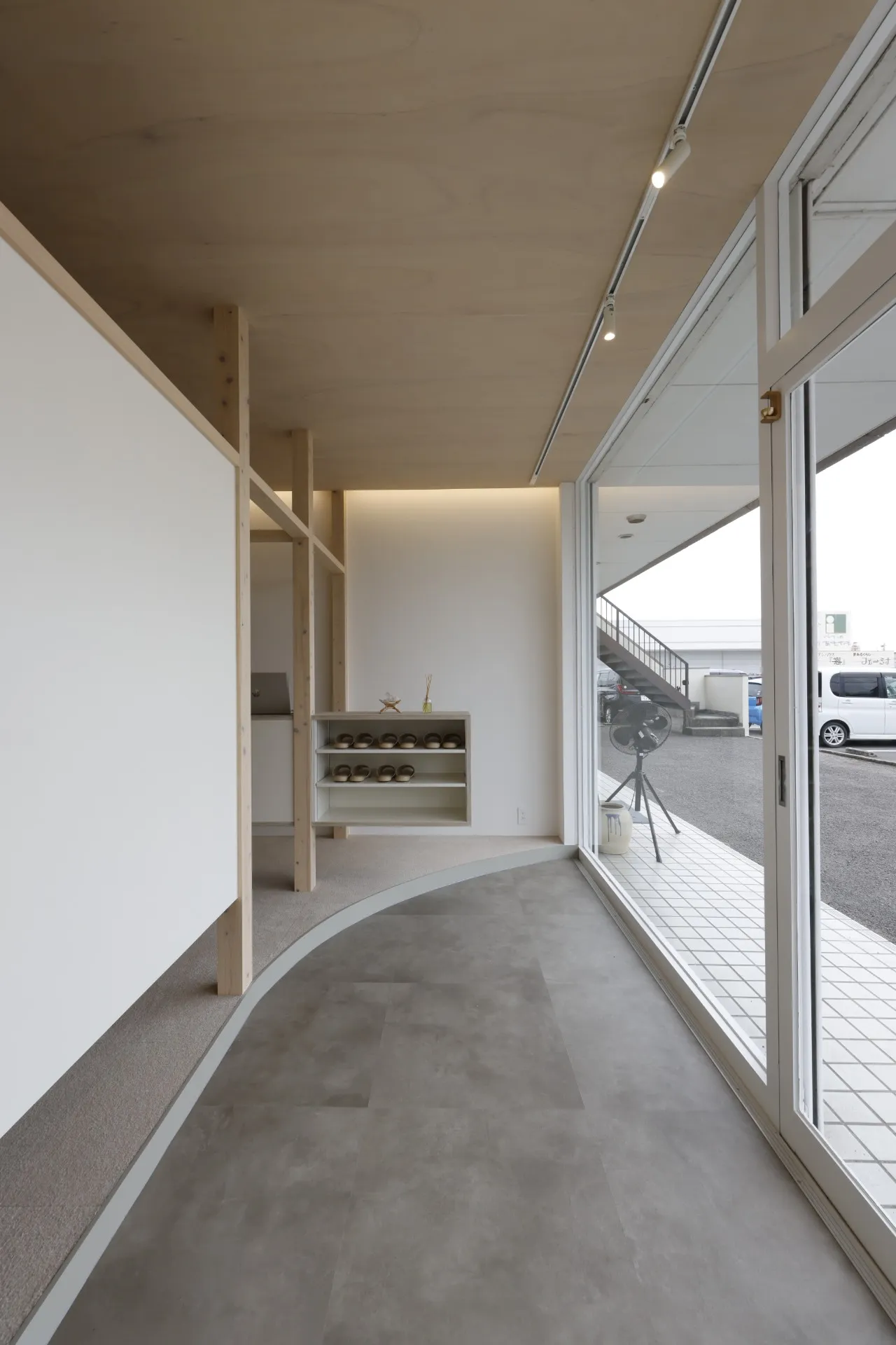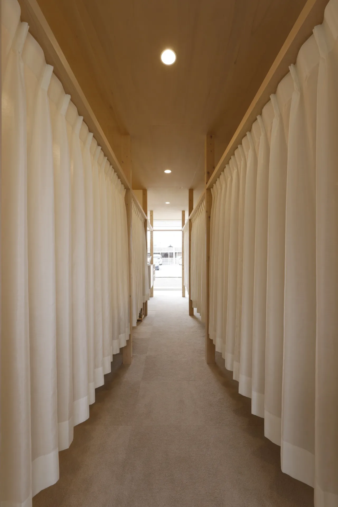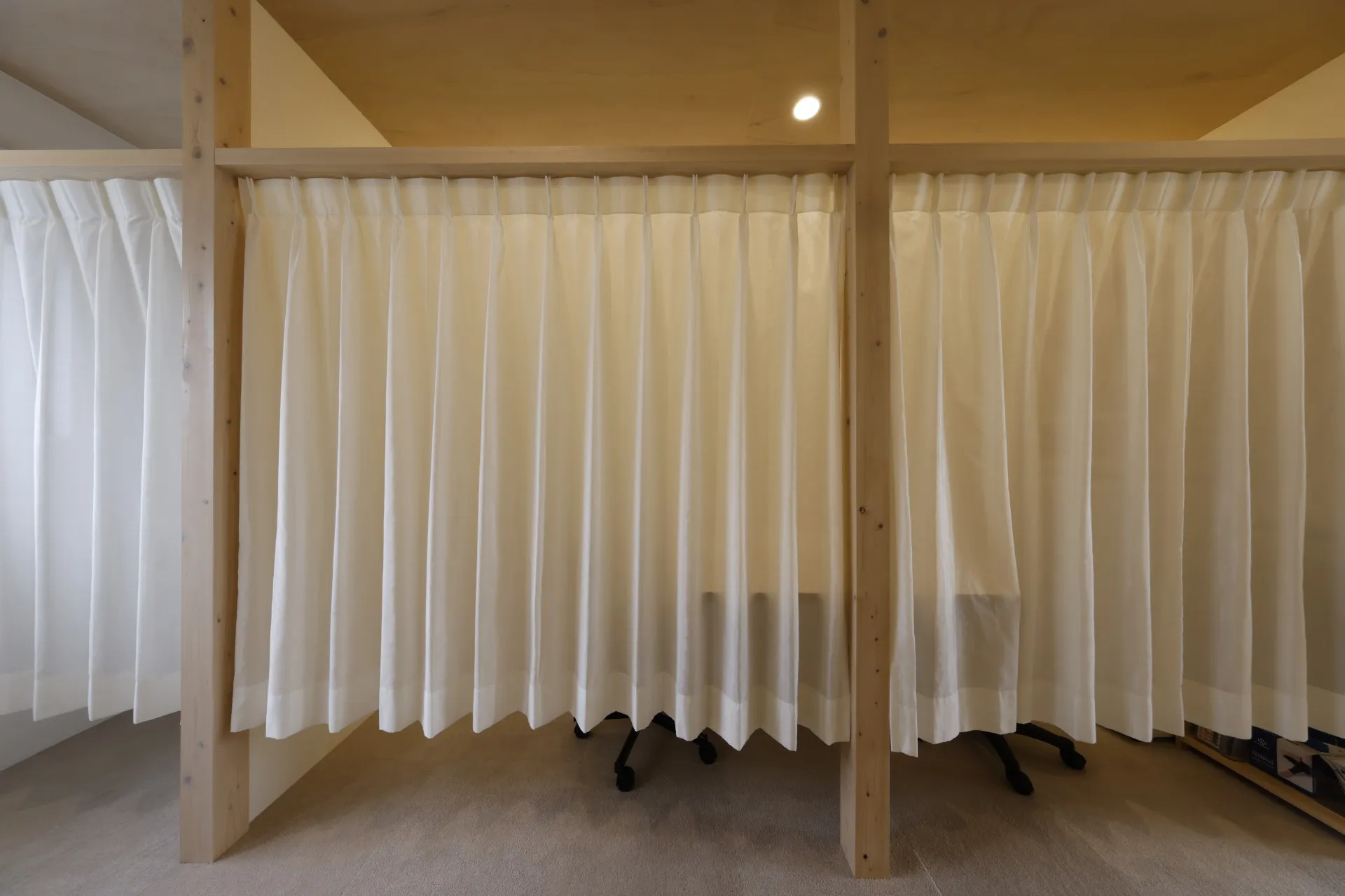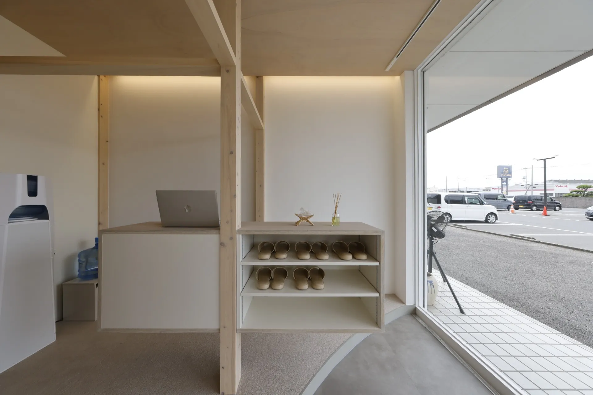 院名でもある「アキレア」の花言葉「癒し・治癒・真心」をコンセプトに、軽量鉄骨の無機質な空間に化粧柱と真壁によりパーテーションを構築。患者様が安らげる空間になるようリノベーションしました。アキレアの白い花に合わせて清潔感のあるふわっと優しい雰囲気を目指しました。真壁風の白壁とレースカーテンが優しい印象となり、温かく柔らかな間接照明が患者さんの緊張を和らげてくれます。